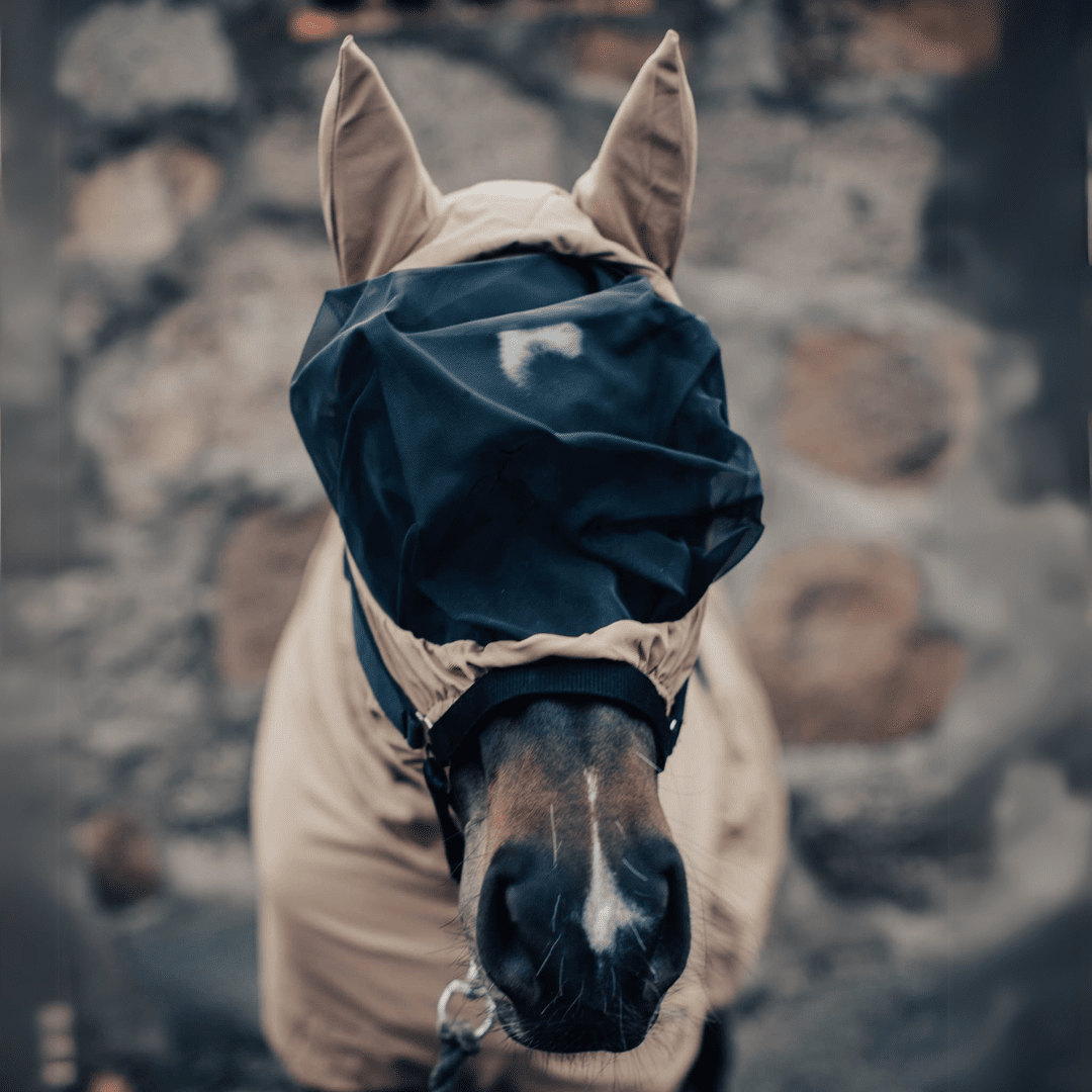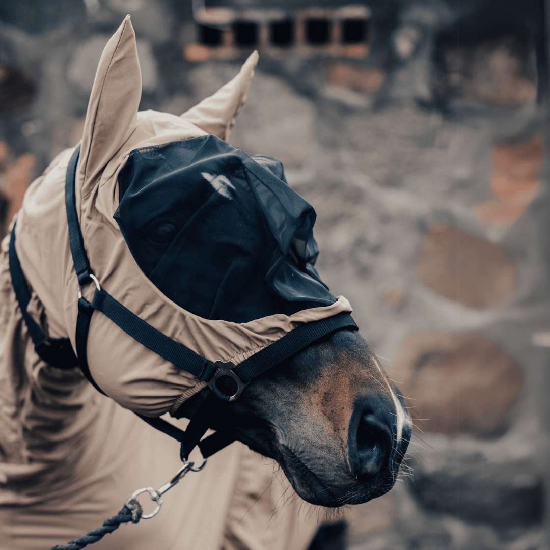 Flug- och eksemhuva med finmaskigt nät som buktar ut för att inte ligga an hästens ögon. Skyddar mot sol och knott hela säsongen. Huvan träs på över huvudet och har resår runt halsen, under käken och runt nosryggen. Kardborreband för att justera storleken runt nosryggen. Materialet är tätt, luftigt och slitstarkt.