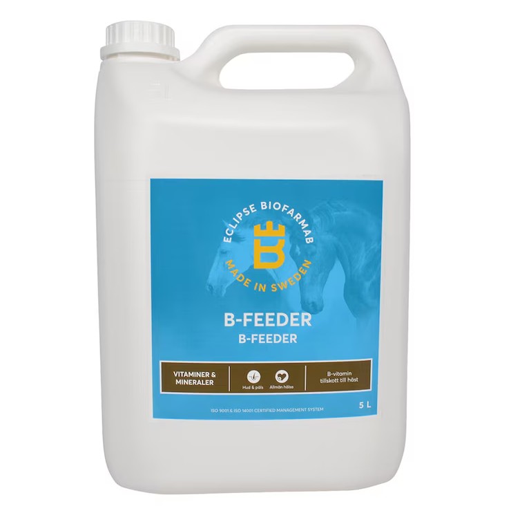 B-feeder är koncentrerad B-vitamintillksott i flytande form. Används när fodrets B-bitamininnehåll inte tillgodoser hästens behov. Används med fördel vid pälssättning, pälsfällning, hård ansträning eller påfrestande situation.