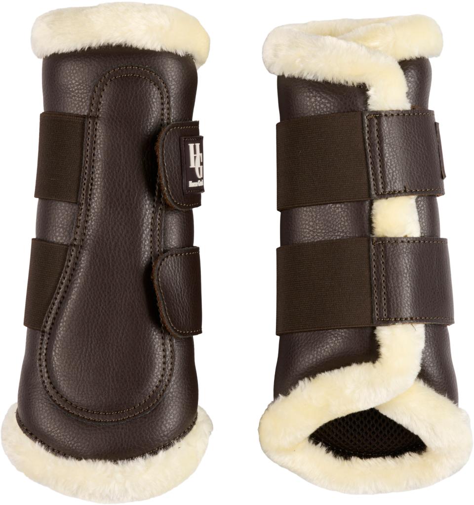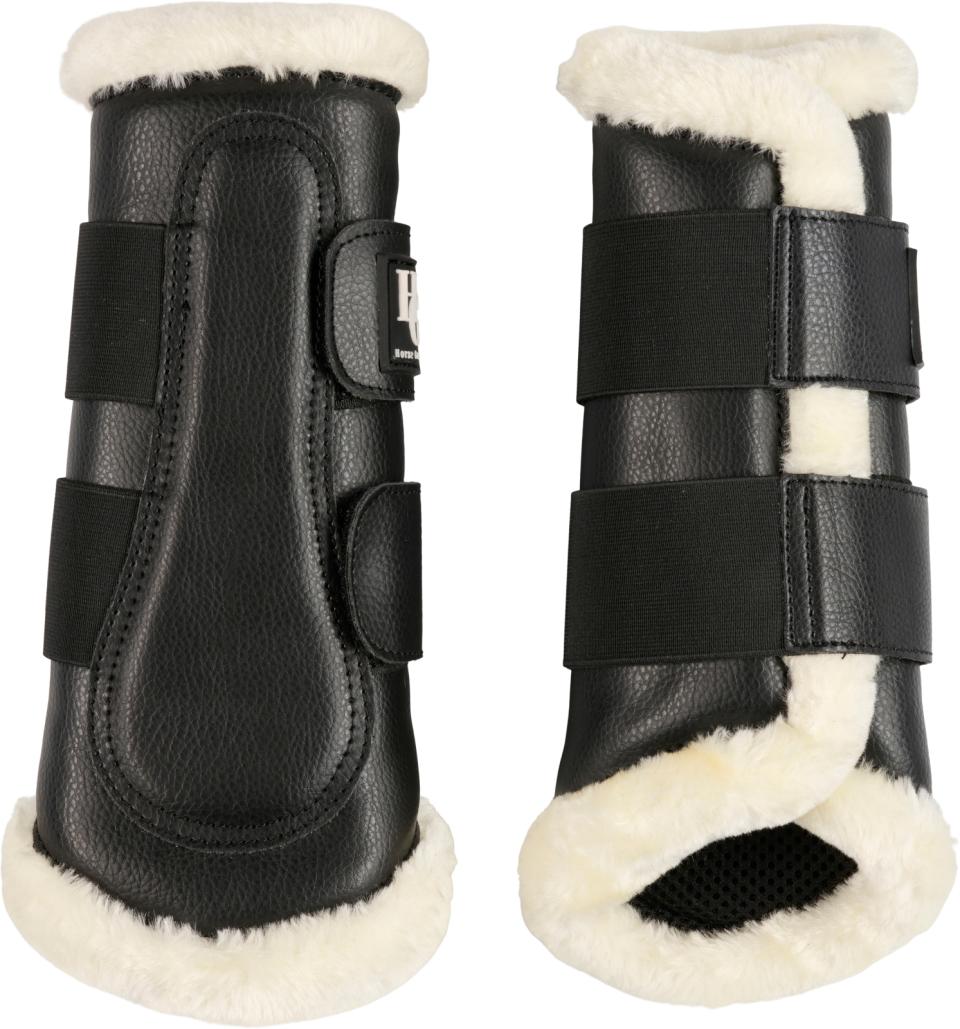 Benskydd / damask i läderlook med ett flexibelt yttre skal. Meshfoder på insidan som andas och fuskpälskanter för att förhindra skav och irritation. Lämplig för daglig träning och kan bäras på både fram- och bakben. Breda elastiska kardborrband gör att benskydden anpassar sig efter hästens ben. Säljes i par.
