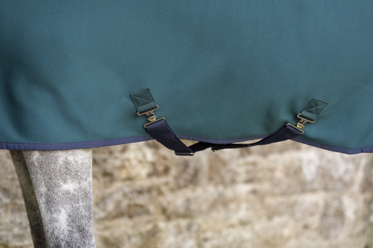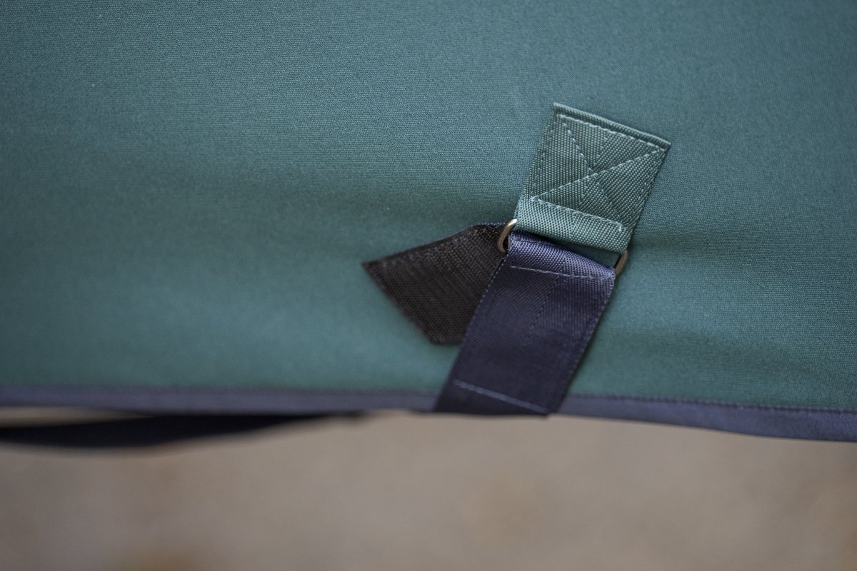 Täcket har bra andningsförmåga och är utrustat med klassisk frontknäppning. Dubbla avtagbara maggjordar för bästa passform och flexibilitet och ett bogspänne.