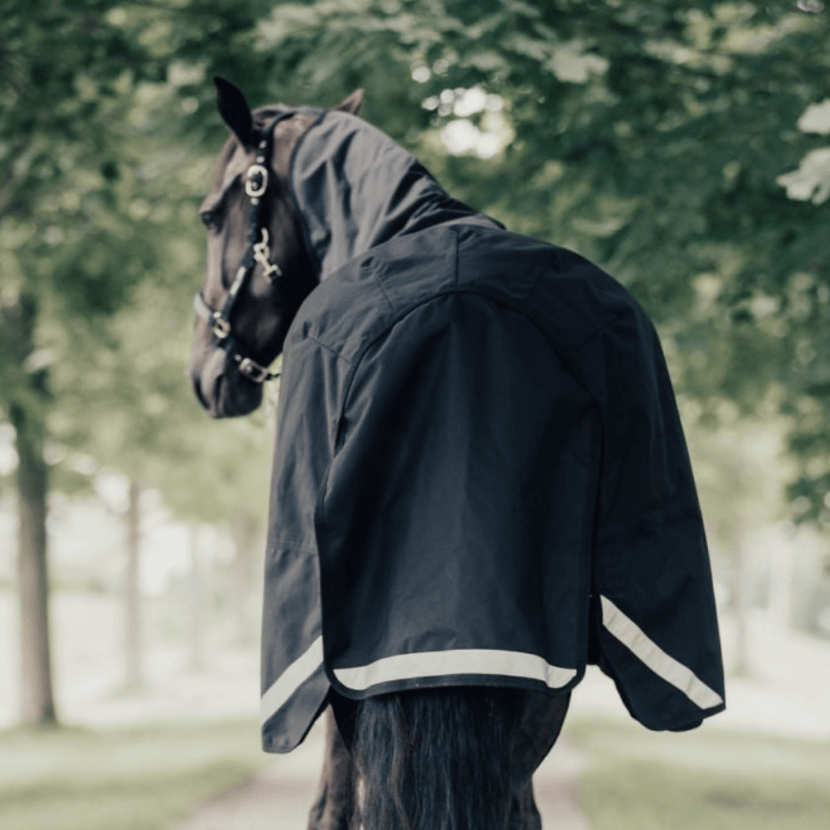 Regntäcket är mycket uppskattat för sin passform och genomtänkta funktioner så som Quick-V frontknäppning som gör det enkelt att ta på och av, reflexer samt en extra stor svannskappa som skyddar mot väder och vind. Utetäcken ur Premium Kollektionen är alla utrustade med tre stycken maggjordar som säkerställer passformen, samt en avtagbar halsdel. Dessutom finns det anordning för att fästa liners i olika tjocklekar för att göra täcket ännu mer användbart.