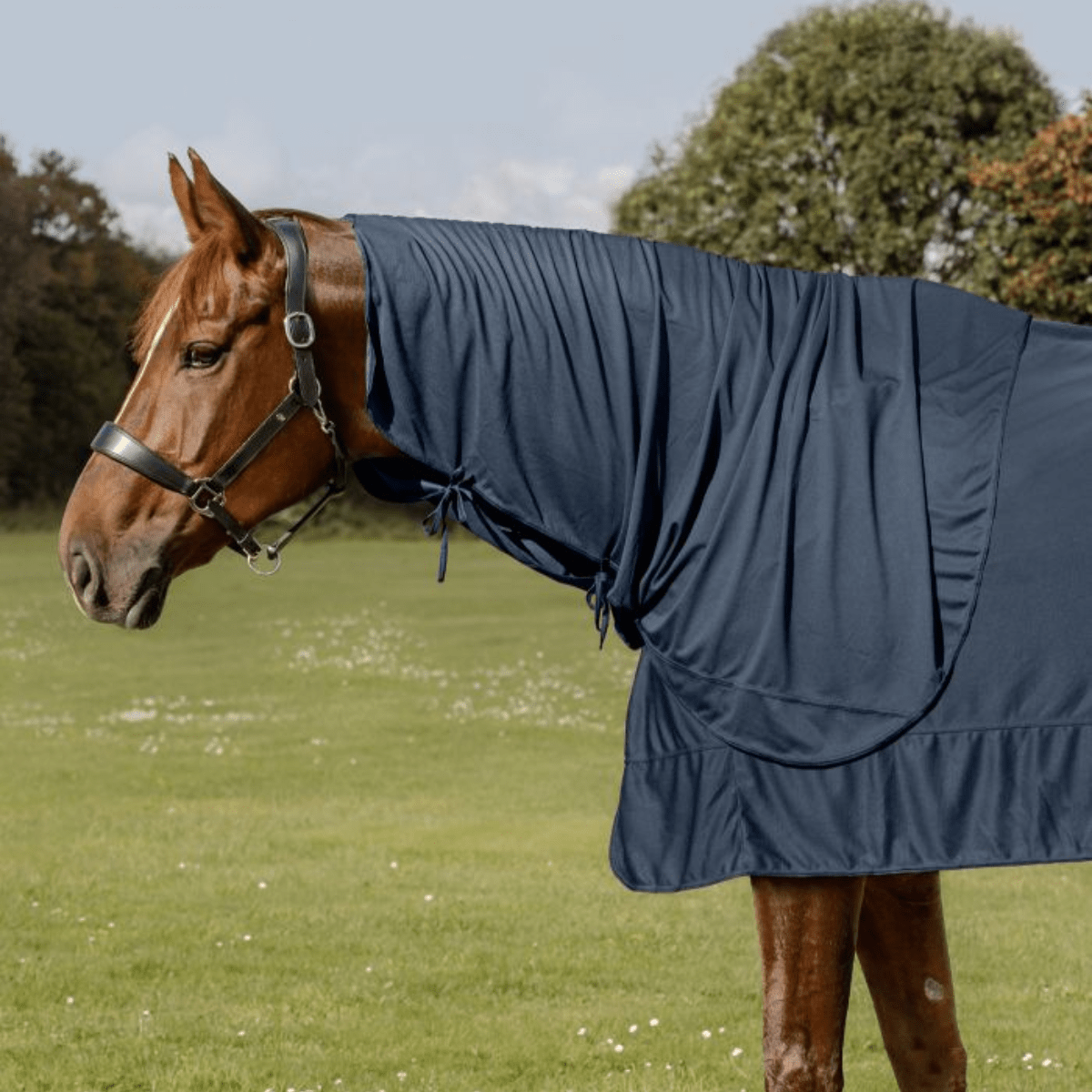Tack vare det praktiska kardborrefästet kan halsstycket säkert och enkelt fästas på täcket och grimman. Använd endast under övervakning. Under användning bör hästen inte röra sig fritt eller mycket för att möjliggöra kylning under en fysisk vilofas.