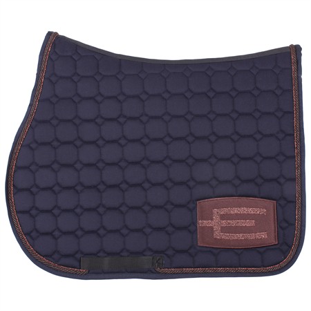 Blått hoppschabrak med den populära E-loggan E60 (Brown-glitter bronze) på vänster sida, samt med passpoal P43 (brown, 6 mm) ytterst och passpoal P102 (bronze glitter, 3 mm) innerst.