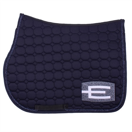 Blått hoppschabrak med den populära E-loggan E69 (Glitter navy-white) på vänster sida, samt med passpoal P97 (navy glitter, 6 mm) ytterst och passpoal P387 (navy glitter, 3 mm) innerst.