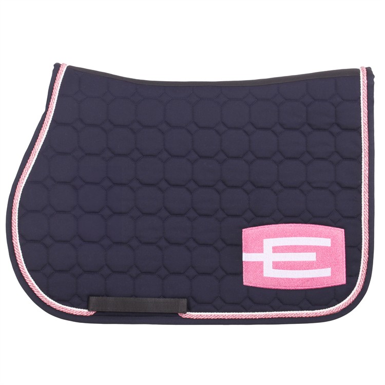 Blått hoppschabrak med den populära E-loggan E19 (glitter pink-white) på vänster sida och med passpoal P111 (Rose glitter, 6 mm) ytterst och passpoal P3110 (white glitter, 3 mm) innerst.