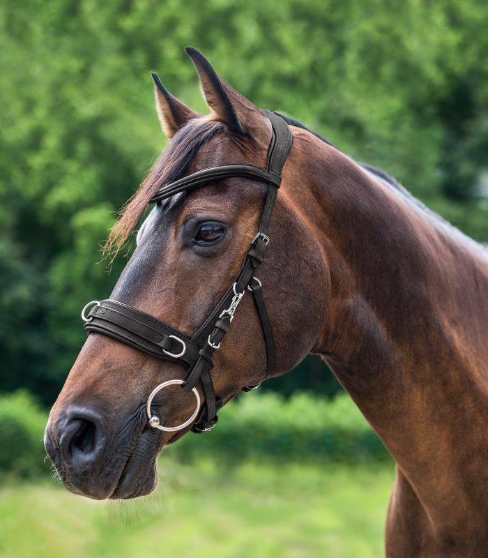 Anatomisk kapson som ger gott om utrymme vid öron och kindben. Mycket mjukt vadderad. Beslag i rostfritt stål och tillverkad i högkvalitativt läder. Kan användas med och utan bett.