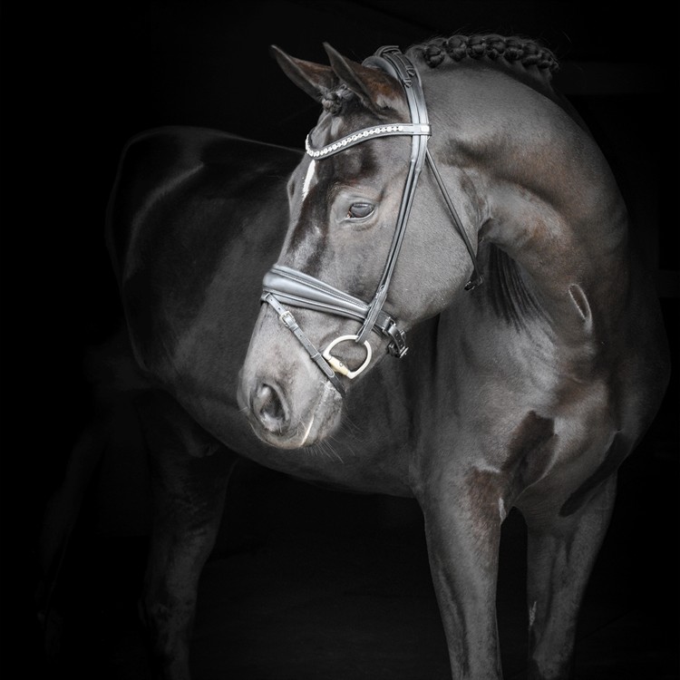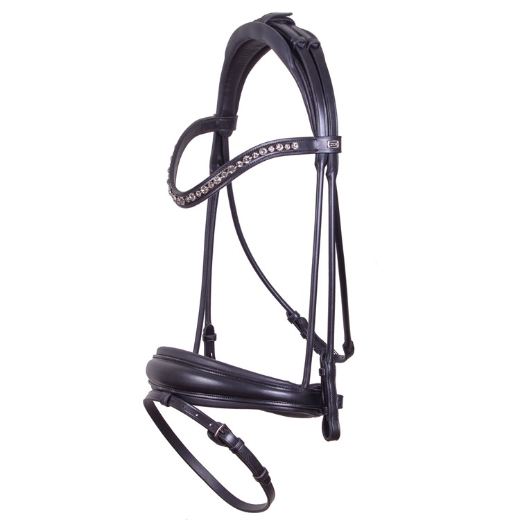 Elegant rundsytt dressyrträns i exklusivt italienskt läder. Sidostyckena har spännen i nacken för diskret look. Nosgrimma med pullback-funktion. Mjuk padding i nackstycke och nosgrimma. Stilfullt svängt pannband med Swarovskistenar i grått.