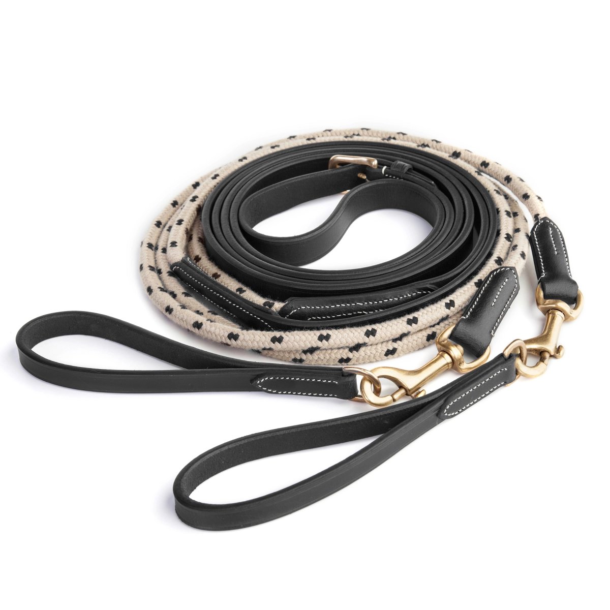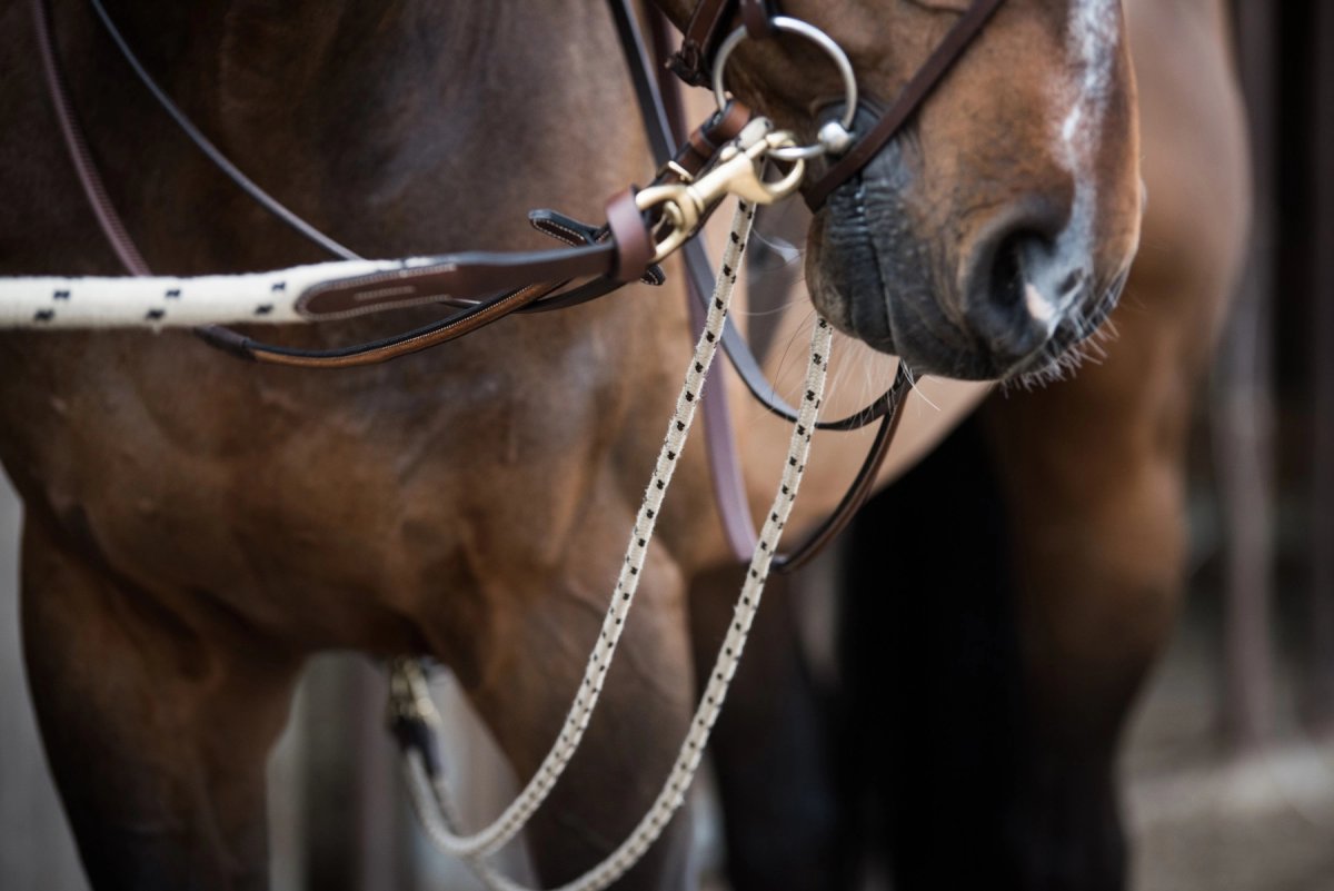 Lädergraman i mjukt oljat läder med rep i ändarna. Dubbla sadelgjordsfästen.