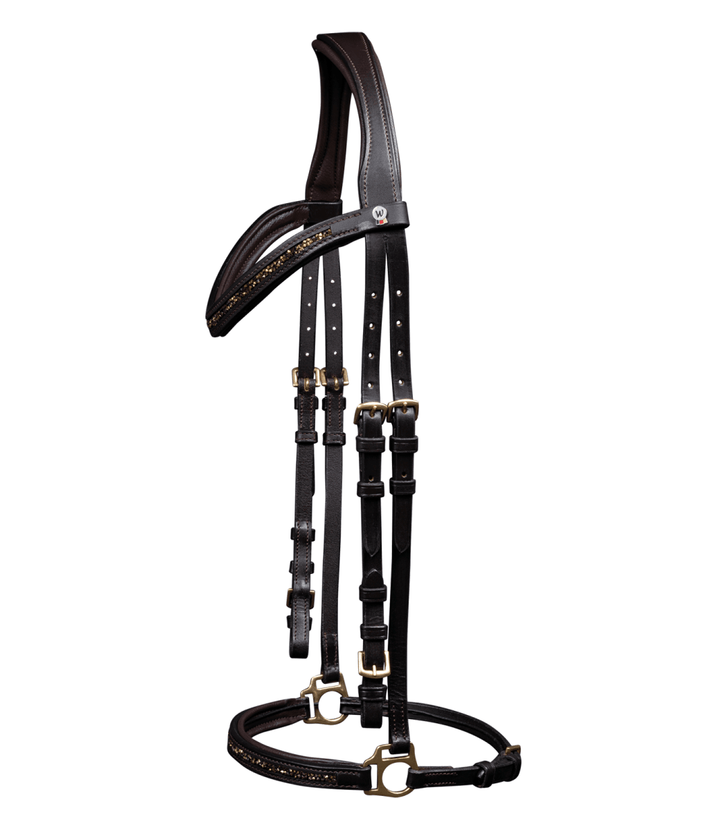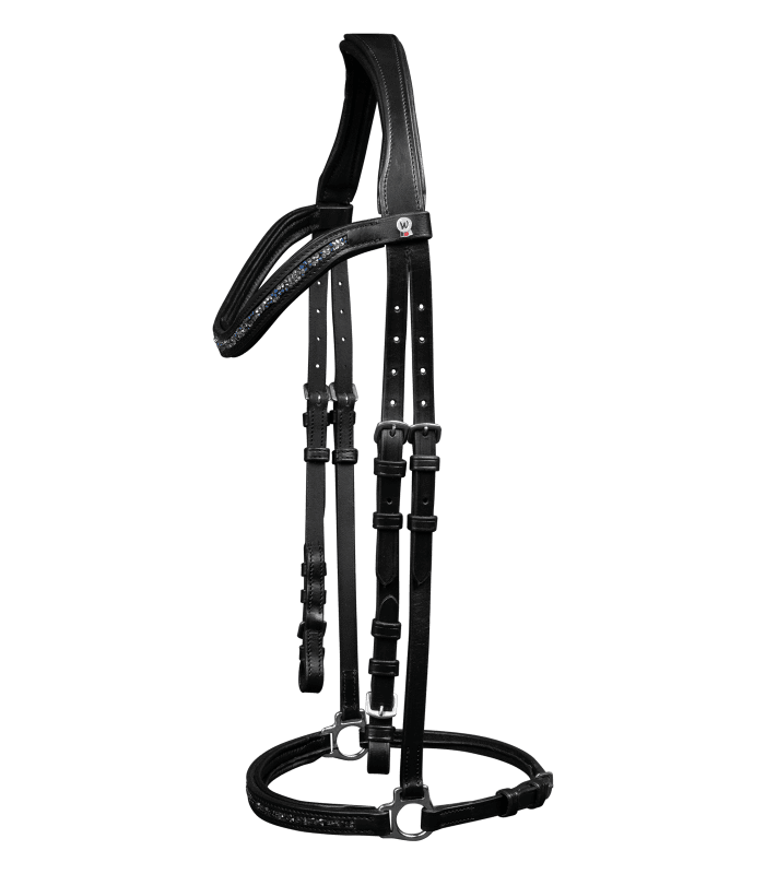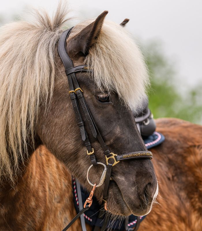 Islandsträns med anatomiskt nackstycke. Mjukt och följsamt läder med strass både på pannband och nosgrimman.