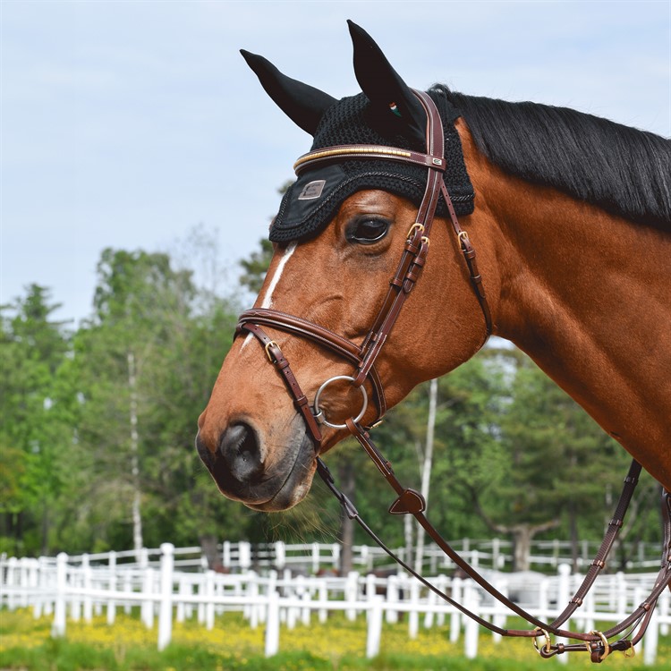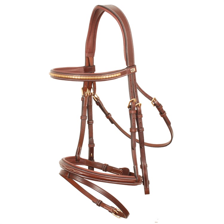 Elegant träns i italienskt läder med stilrena vita sömmar, mässingspännen, klassiskt pannband med snygg mässingklinkers och kombinerad paddad nosgrimma med smakfull mönstersömnad.