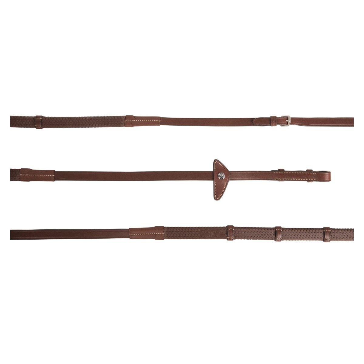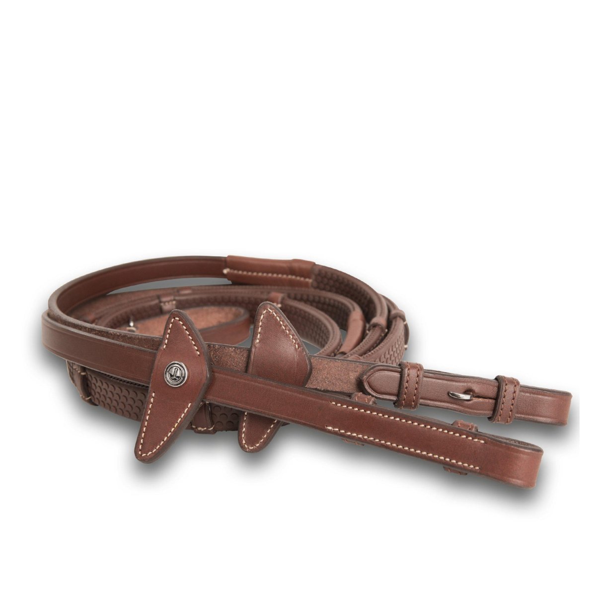 Mjuk gummitygel KRIS™ i hög kvalitet med stoppar i läder och martingalfluga. Högkvalitativt noga utvalt Europeiskt läder.
