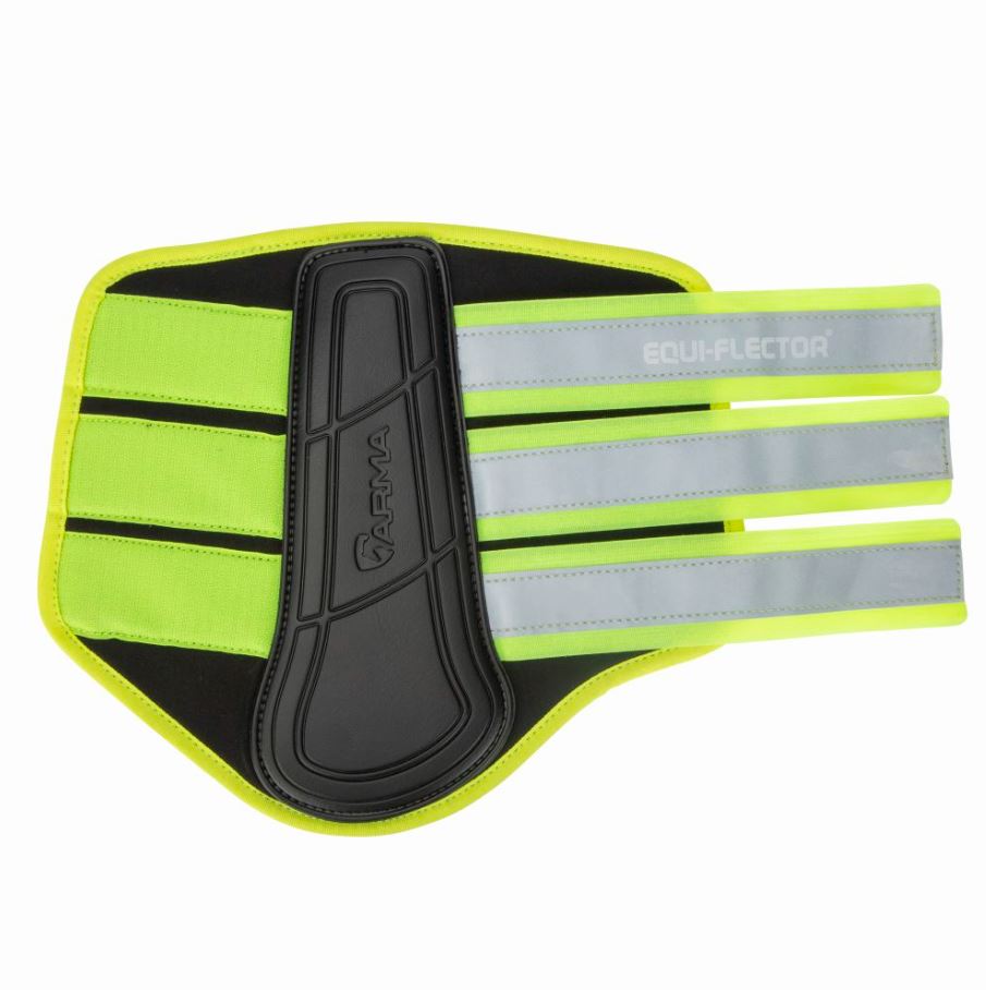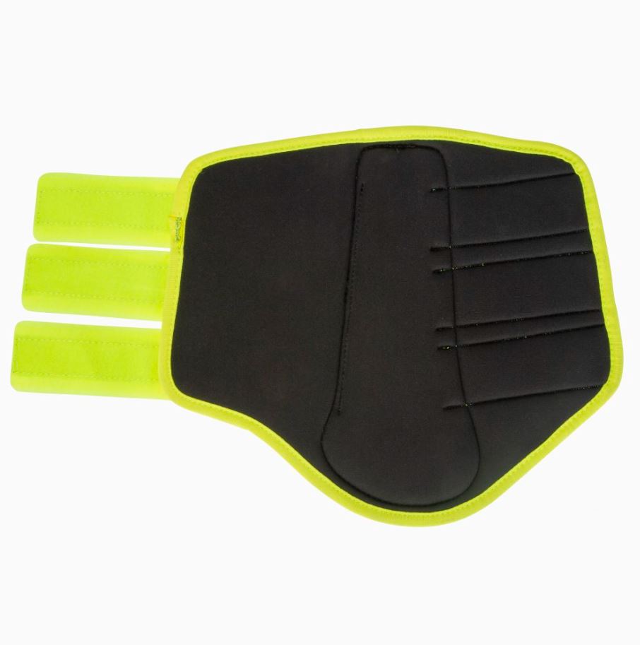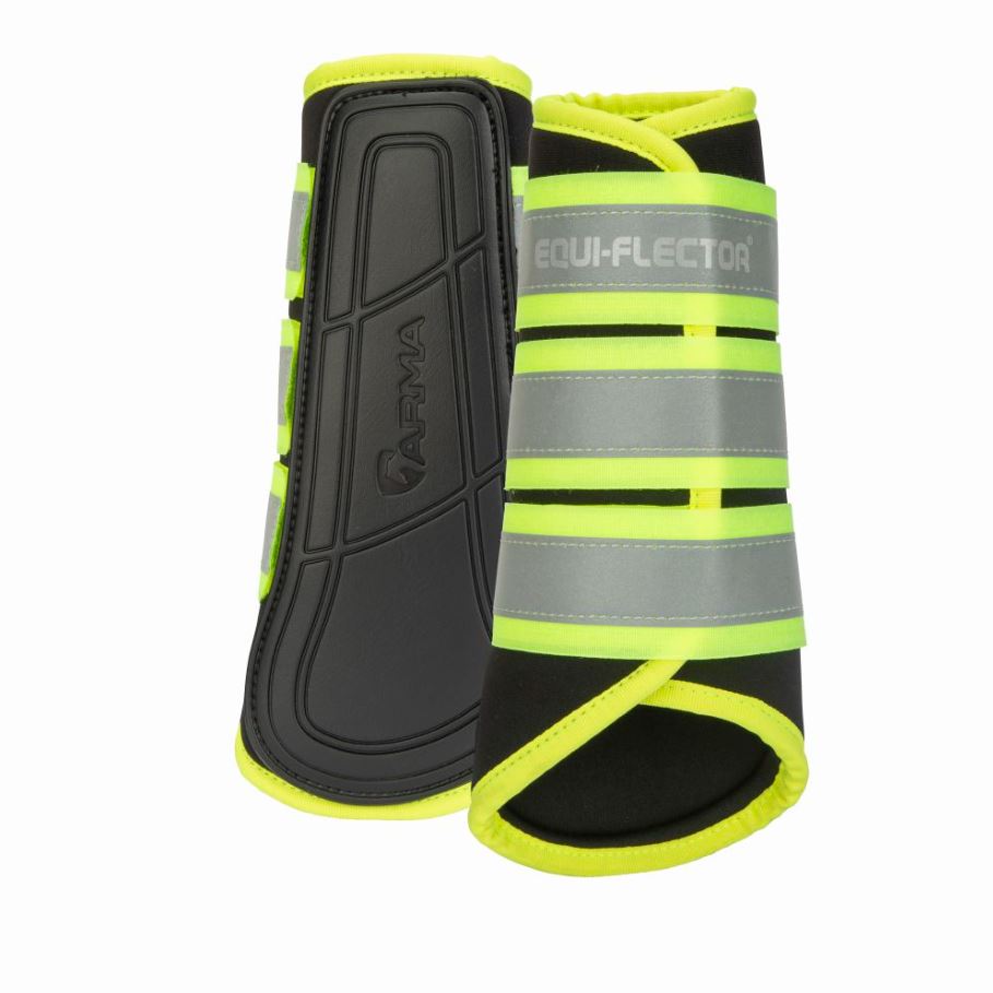 Neoprenbenskydd med reflexer och kantband i klara färger. Konturvadderad insida och rejäl kardborreknäppning