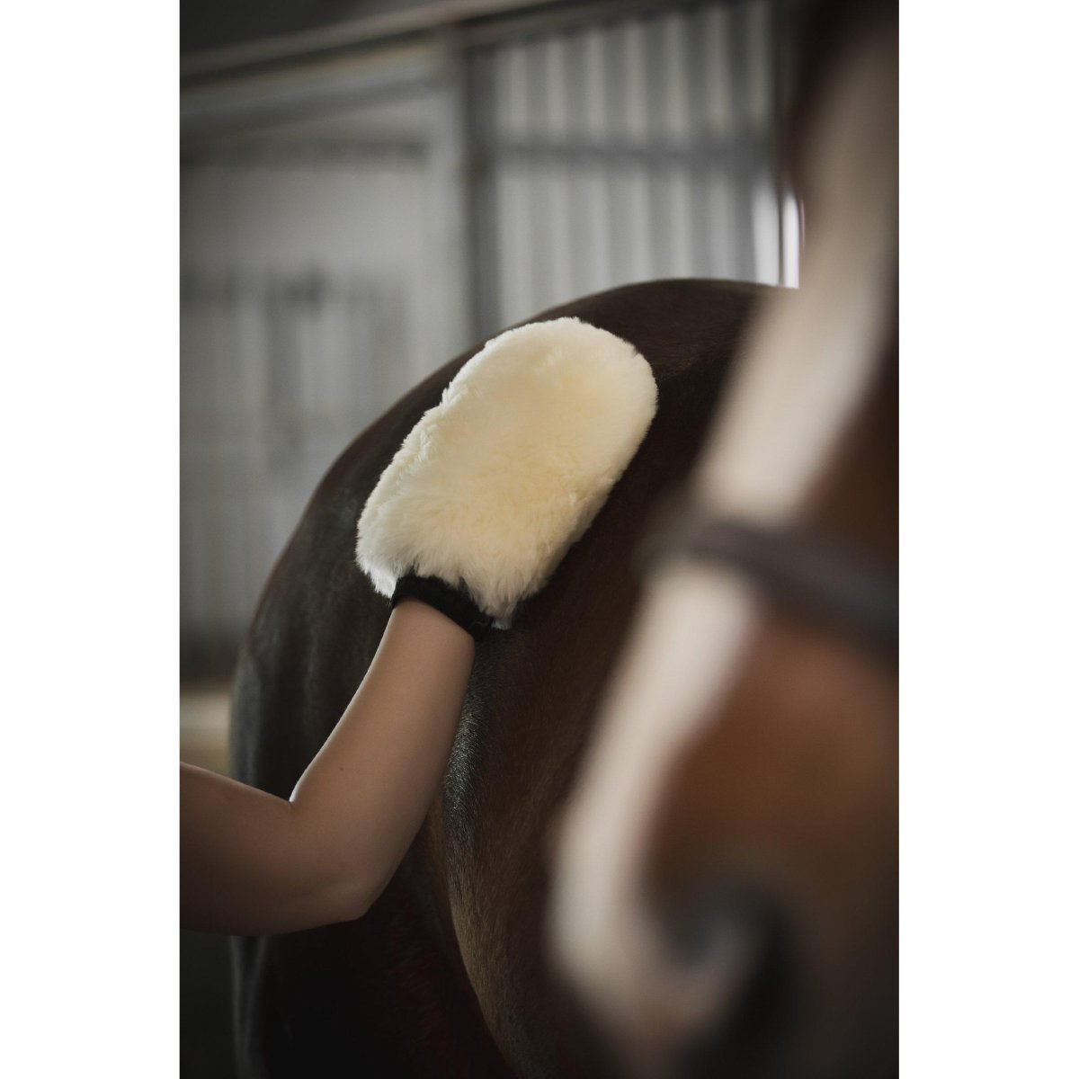Dubbelsidig putshandske av högsta kvalitet i äkta fårskinn. Perfekt till att göra den sista putsen på din häst men även till att använda som putsvante till din sadel. Groominghandsken tar bort det där sista fina dammet i pälsen och ger extra fin lyster. Handtvätt 30 grader med mild tvål/såpa.