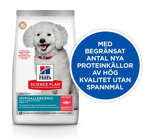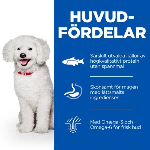Hundfoder Hypoallergenic small & mini Hill´s hundfoder med lax är ett hypoallergent, välsmakande torrfoder skräddarsytt för små vuxna hundar (1-6 år) med tecken på foderöverkänslighet. Detta torrfoder är gjort av ett begränsat antal högkvalitativa proteinkällor, inklusive lax och tonfisk. Fodret är fritt från spannmål. Dess lättsmälta ingredienser som potatis och näringsgivande Omega-3 och Omega-6 fettsyror gör det till ett skonsamt och hälsosamt alternativ för din hund som visat tecken på foderöverkäsnlighet mot proteinkällor eller spannmål.