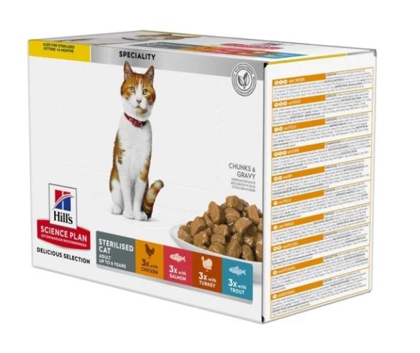 Hill's Science Plan Adult Sterilised är ett balanserat, fettsnålt våtfoder som utformats specifikt för att tillgodose behoven hos unga, kastrerade katter för att hålla dem i form och friska. Katter tenderar till att bli överviktiga efter kastrering eller sterilisering. Ingreppen gör att ämnesomsättningen bromsas och energibehovet är mycket lägre än innan, men samtidigt får katten ökad aptit.