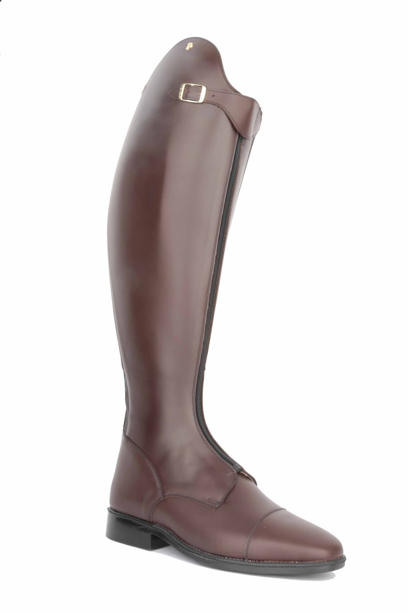 Denna polostövel från Petrie är gjord i ett mjukt rindbox läder på utsida och fot. Insidan av stöveln är i ett extra greppläder som ger stabil kontakt med hästen. Stöveln har en klassisk dressyr fot med en elegant något fyrkantig tå. Polostöveln Verona har 6 cm hög både som ger längd och ett elegant uttryck till stöveln. Dragkedjan sitter mitt framtill för att förhindra kontakt med sadeln och därmed skav mot sadeln vid frekvent ridning. Längst upp på stöveln sitter också ett snyggt polospänne med gulddetaljer som fästs och lossar med tryckknapp. På hälen sitter en liten pigg för att hålla sporren i rätt position. Dekorerad med söm över tån.