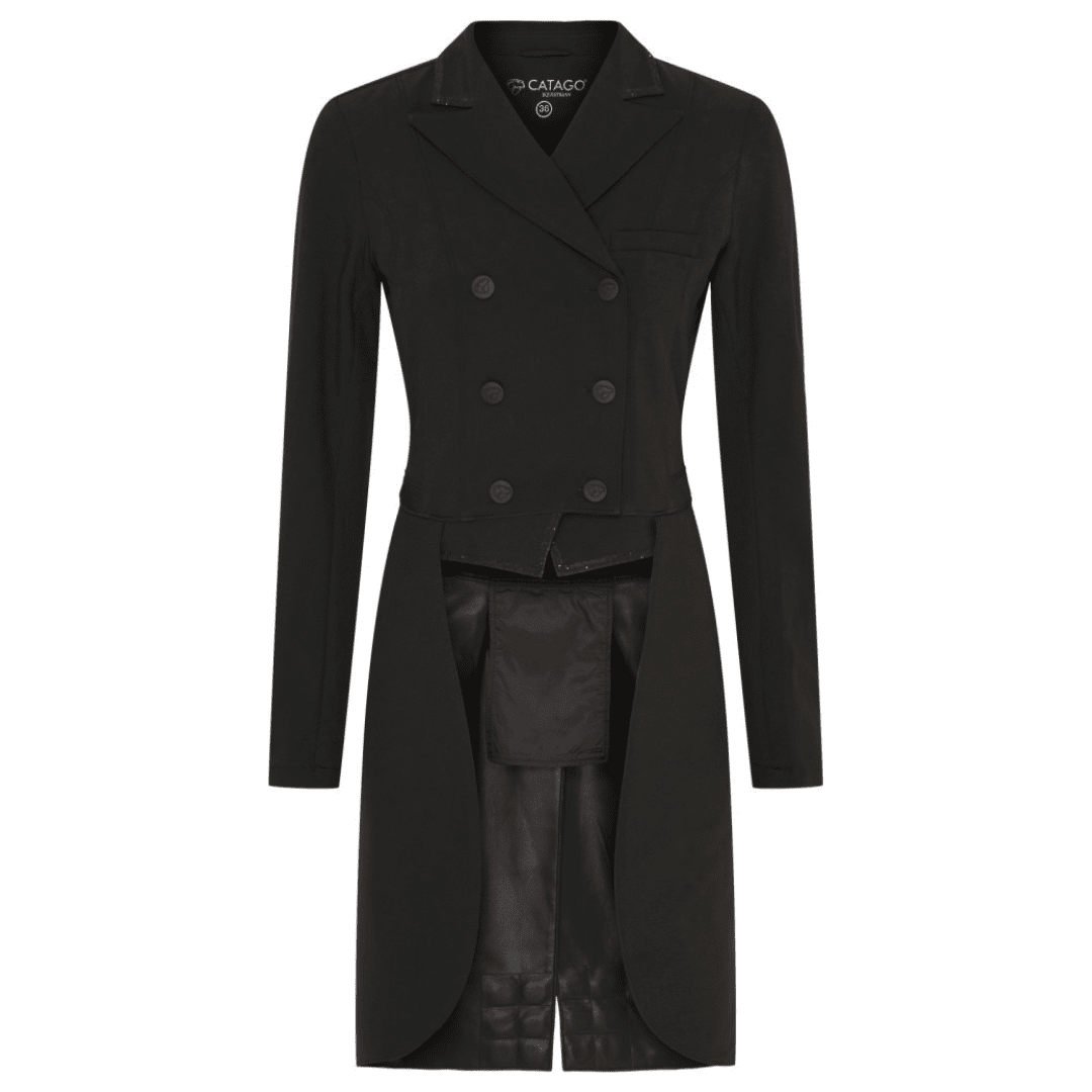 Högfunktionell, elegant dressyrfrack från Catago. Modern i typen med stratchigt material som andas och leder bort fukt. Detaljer av skimrande kantband ger ett fint helhetsintryck. Det ligger tyngder i frack flärparna för att säkerställa ett städat intryck även till vid ridning.