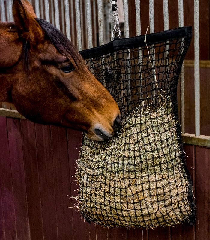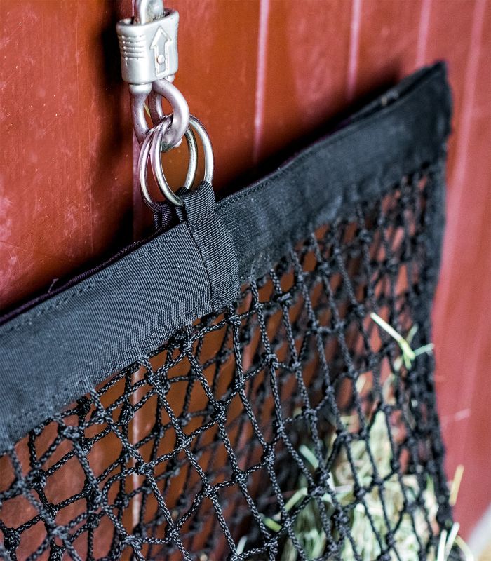 Praktiskt hönät med påfyllnadshjälp. Hålen i hönätet har måtten 3 x 3 cm vilket medför en långsam och hälsosam takt i hästens ätande.