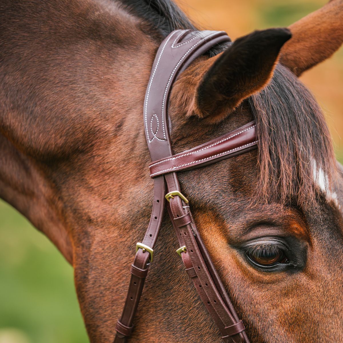 Anatomisk träns i det mjukaste lädret med skön padding för nosgrimma och nackstycke. Detta träns är tillverkat av högkvalitativt australienskt läder som är mjukt redan vid första användning, det är elegant designat med vita stickningar och mässing-färgade spännen genomgående vilket ger en känsla av exklusivitet och prestation. Tränset passar för alla dicipliner men är främst framtaget att passa hopp eller allround hästar.