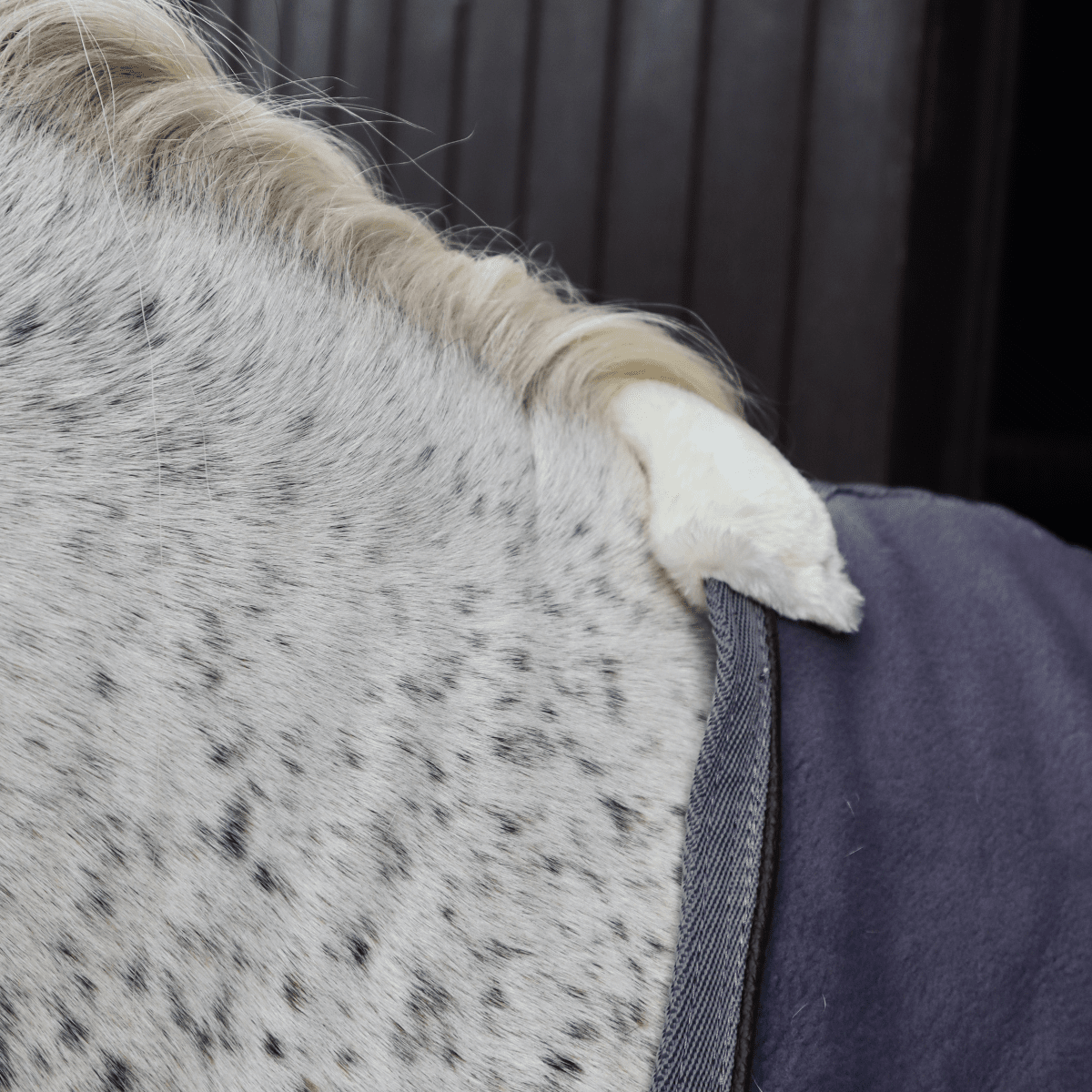 Fleecetäcket har en stilren design med grå färg, matchande grå kant samt en paspoal i brunt fauxläder. Bekvämt ludd över manken som förhindrar skav. Spänns framtill med dubbla T-spännen i guld och har två dolda, avtagbara maggjordar. Inplastad svansrem ingår.