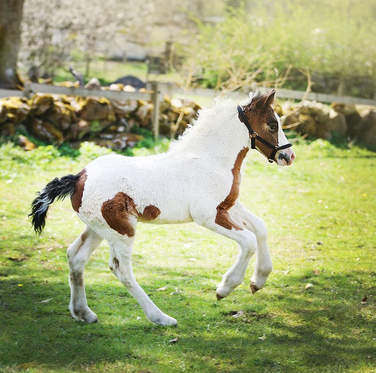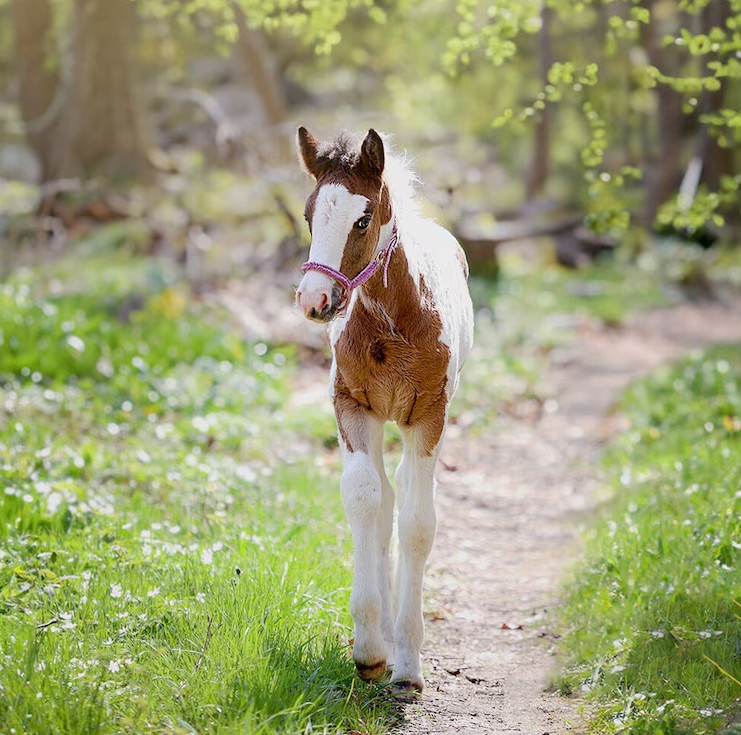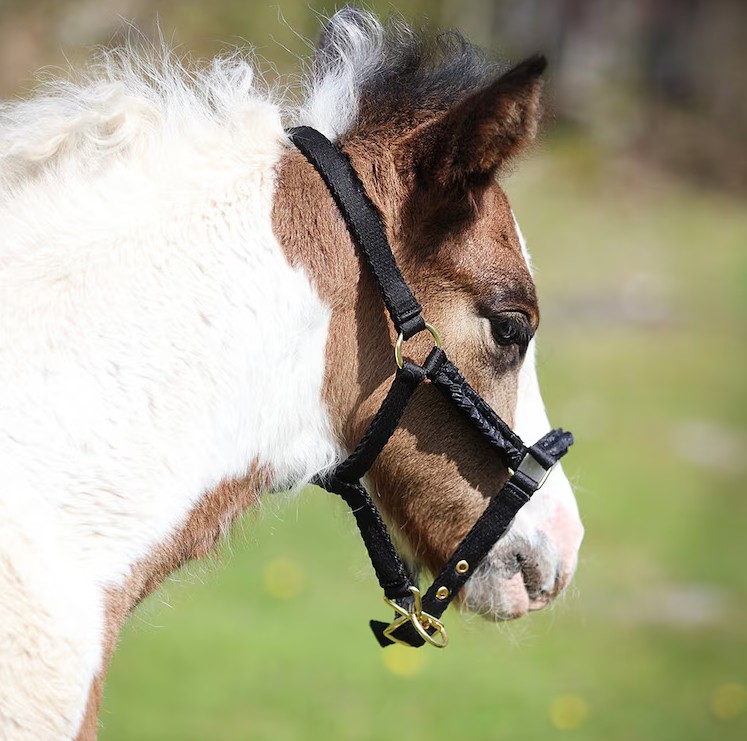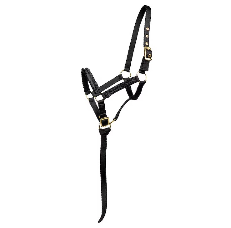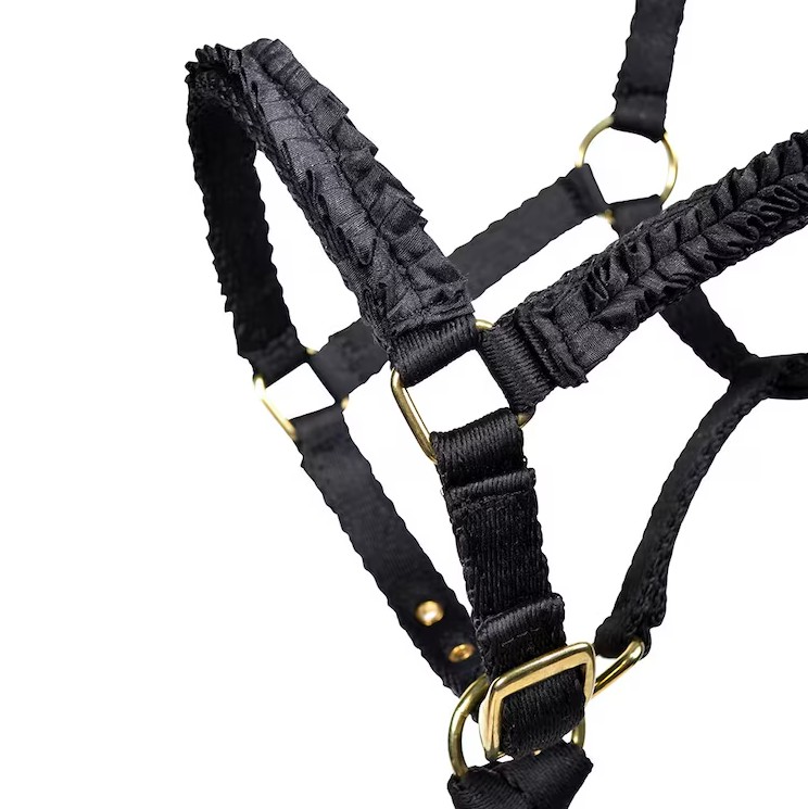 Mjuk fölgrimma, justerbar runt nos och nacke för att passa både små och storvuxna föl. Dekorativa volangdetaljer, guldfärgade beslag och avtagbar praktisk rem undertill fär att enkelt hålla i och fånga in fölet.