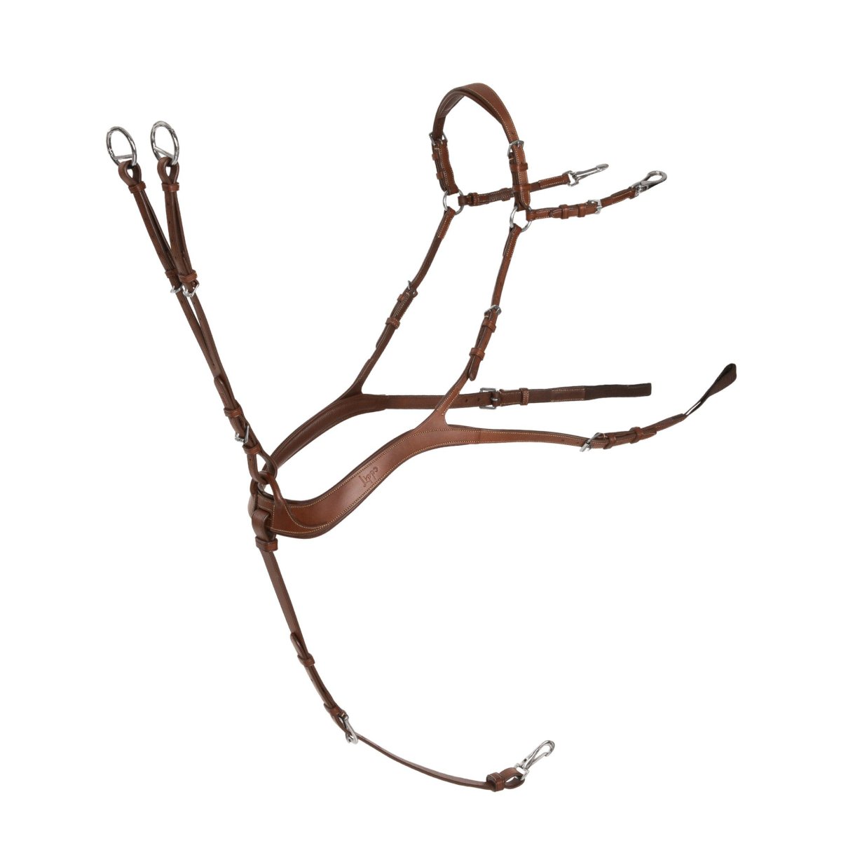 5-punkts brösta kombinerad med avtagbar martingal. Tillverkad i amerikanskt mjukt och smidigt läder. Anatomiskt formad för att ge hästen obegränsad rörlighet. Remmen och snabbhake mellan hästens framben är avtagbar. Dubbla sadelfästen. Praktiska snabbhakar för sadelinfästningen. Smarta öppningsbara ringar med quicksnap-funktion för snabb och enkel montering på tyglarna. Snygga ljusa dekorsömmar och rostfria söljor.