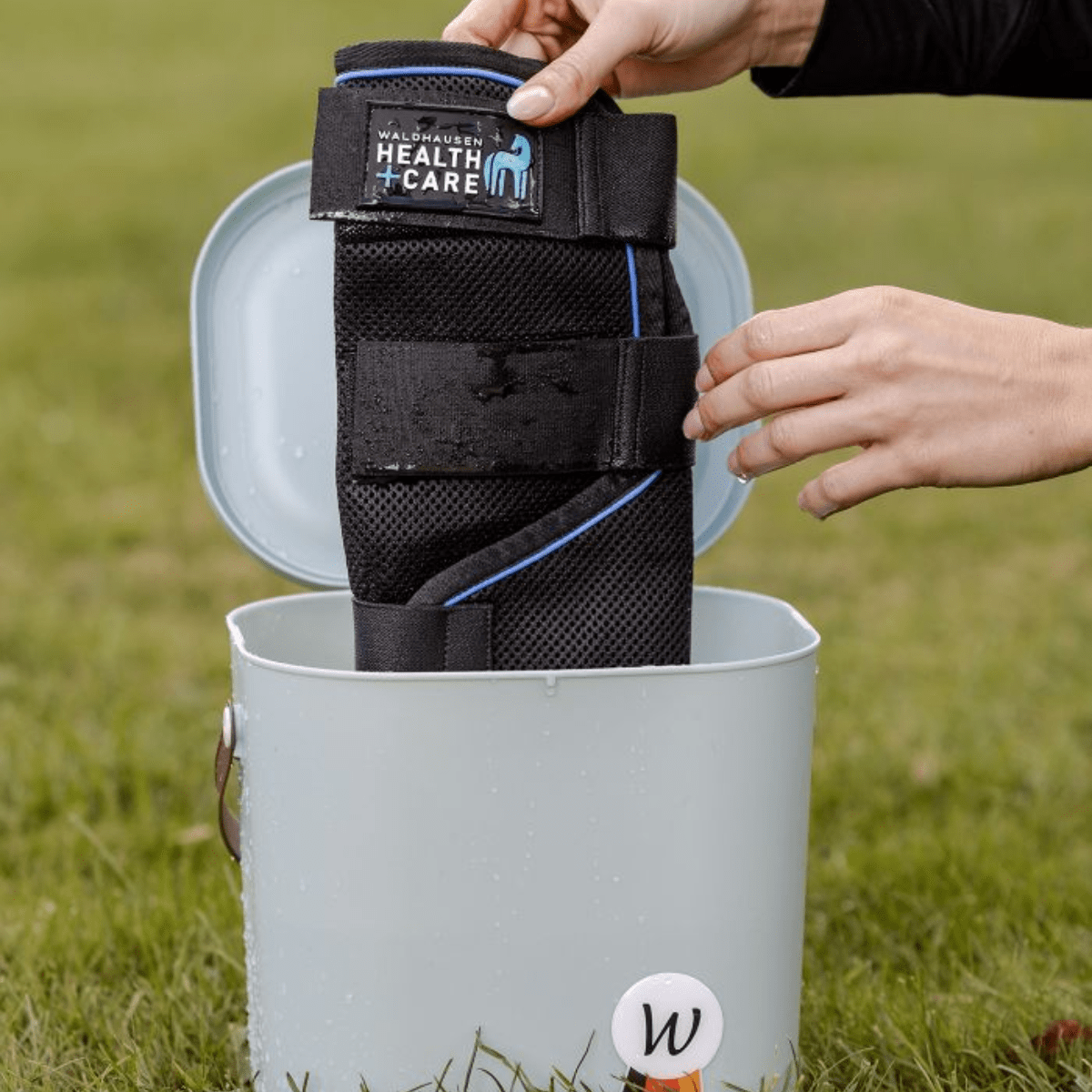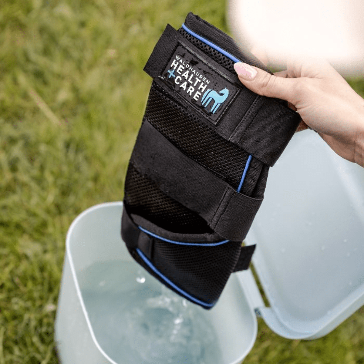 Sänk ner skydden i en hink med vatten tills det har sugits in i materialet. Vrid ur skydden och placera de runt hästens ben. Tack vare de speciella materialen avdunstar vattnet långsamt och extraherar värme i processen som ger en behaglig kylningseffekt.