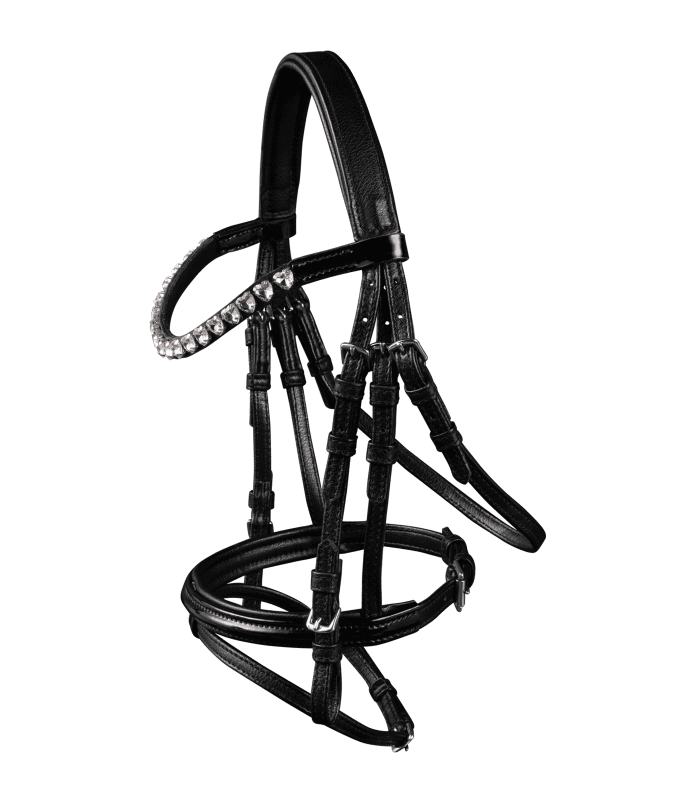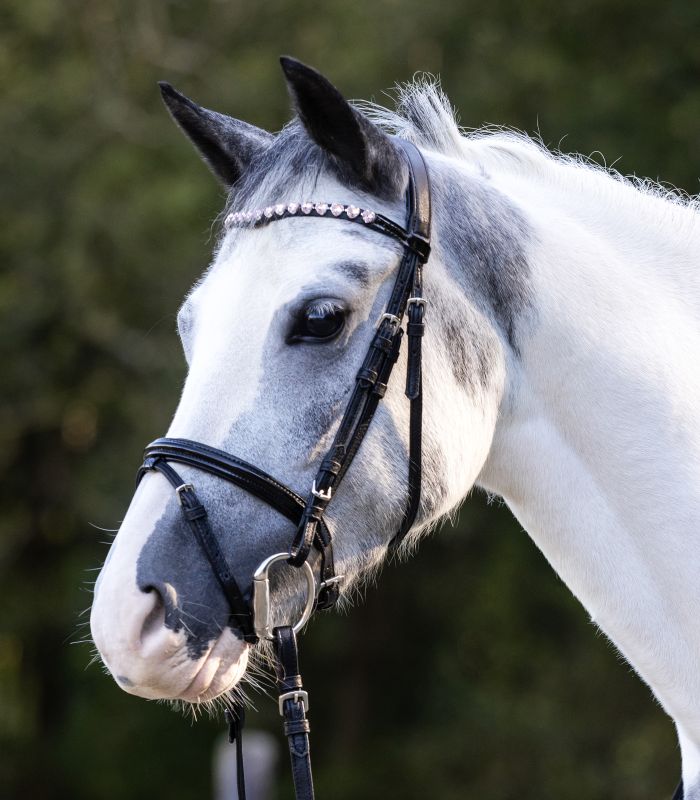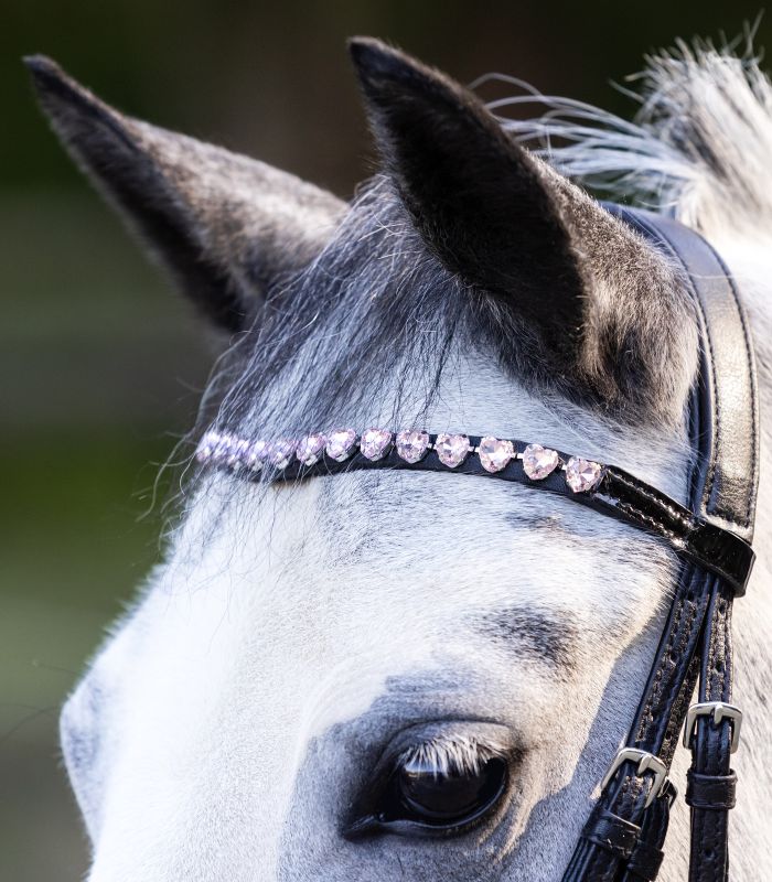 Elegant och gulligt träns för de allra minsta med engelsk nosgrimma. Smalt nätt nackstycke, rakt pannband med rosa skimrande hjärtan.